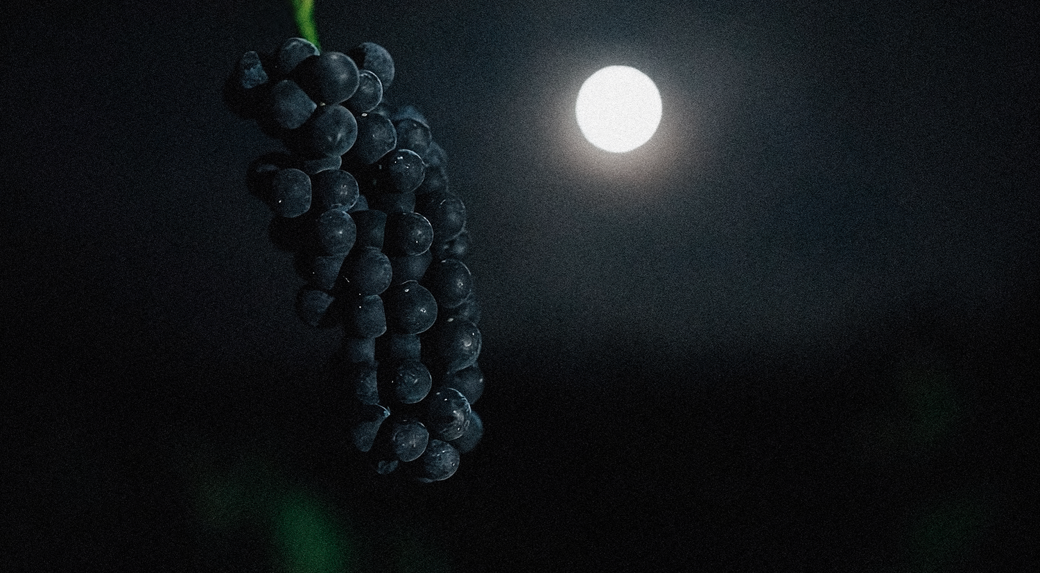 The Moon is an important symbol for NOIR: We harvest under the Full Moon. The gravitational force of the Full Moon pulls water and nutrients from the soil into the vines and creates the juiciest grapes to hand-pick